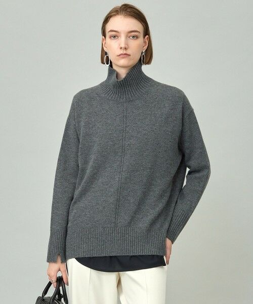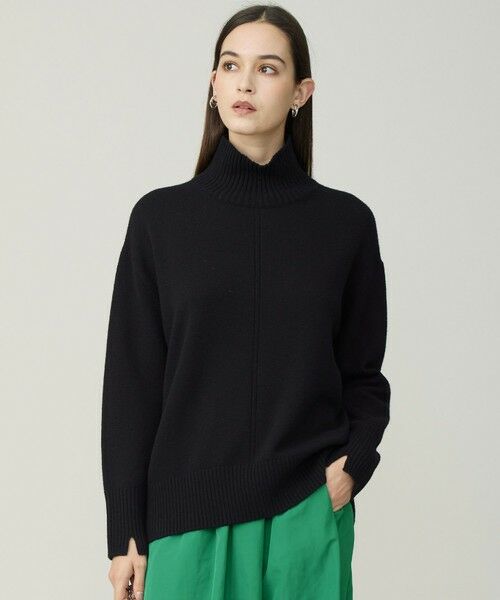 ■デザインリラクシーシルエットのハイネックプルオーバーです。きれいに立ち上がるネック、袖の長めのリブなど、すっきり見えするサイズ感やバランスに拘っています。また、前後身頃中心に編みテクニックのラインでポイントを入れ、袖口はスリットでエッジをプラスしました。単品はもちろん、インナーにシンプルジャージーロングスリーブTシャツやシャツをレイヤードしていただくのもおすすめです。アウターを羽織ってももたつかず、暖かく上品に着こなせる究極のニットプルオーバーです。