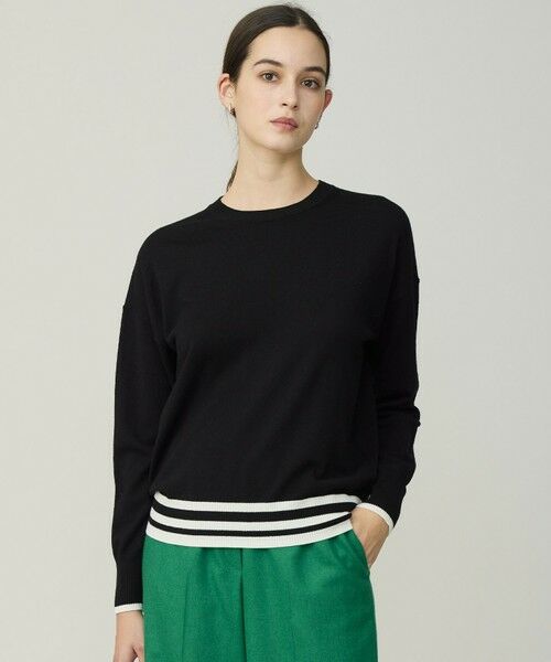 ■デザイン程よくリラックス感のあるドルマンのようなゆったりシルエットと、軽やかな素材感で、ノンストレスな着心地のニットプルオーバーです。ブラック×オフホワイト(705)とネイビー×グリーン(775)は裾と袖口に配色ライン、オフホワイト×ブラック(702)は裾と袖口、ヨーク部分が配色になっており、ICBらしいアクセントが効いています。シンプルなボトムと合わせても着映える一枚です。