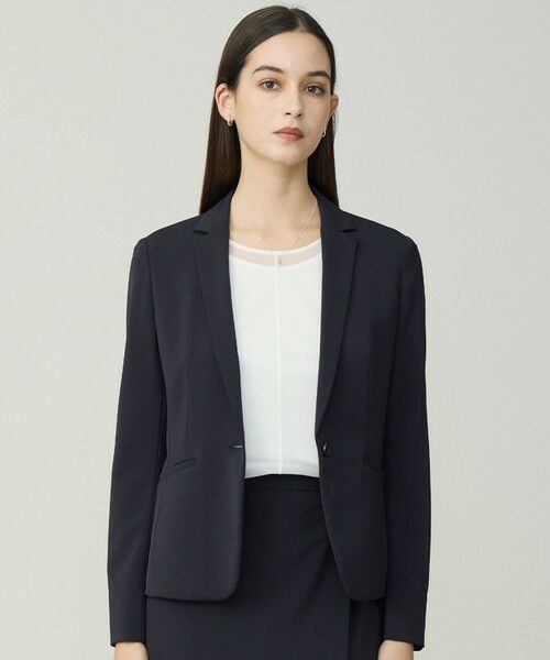 ■素材布帛のジョーゼットのようにきちんと見える、新しいジャージー素材です。伸縮性に優れ、長時間の着用でもノンストレスな着心地がポイントです。シワにもなりにくく、イージーケア性も兼ねた素材です。