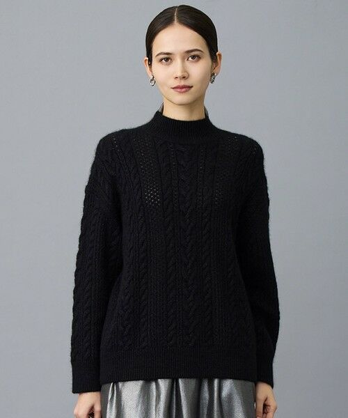 繊細に煌めくラメがポイントのひと目で華やぐケーブルニット■デザイン1枚で華やかな印象になるケーブルニットです。ヘアリーな素材と繊細に光るラメ、軽やかさを意識したメッシュとケーブルの柄構成それぞれを組み合わせることで上品なウインターニットになっています。ほどよレングス感で、ボトムスを選ばず合わせていただけます。■素材毛足が柔らかくしなやかなフォックス混の糸に繊細なラメをミックスした上品でヘアリーなミドルゲージニットです。