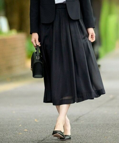 ・シンプルなボックスタックスカート・透けを気にせず着用できるサテン裏地付き・後ろゴム仕様で程よいフィット感と快適な着心地・シンプルなデザインで、普段使いも可能・後ろ中心部分のボックスタックを無くすことで、座ったときの乱れが気になりにくいデザインに