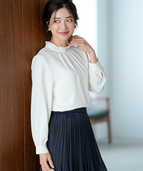 ・定番人気のフリルネックデザイン・甘くなりすぎず上品に着られる程よいフリル感・きちんと感のある袖元のカフスデザイン・前後差のある程よい着丈と、脇のスリットでレイヤードにぴったり