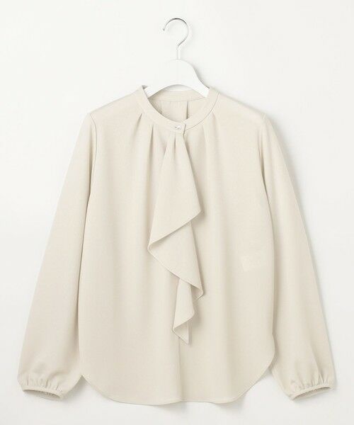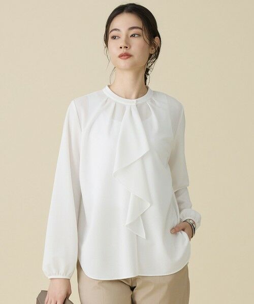 インもアウトも様になる着回し力の高いブラウス■デザインアムンゼンジャージならではの繊細なシボ感が美しい素材を活かし、ブラウスのように上品に仕上げたジャージトップスです。前立てに施したタックとラッフル襟が華やかなアクセントになり、1枚で着映えるデザインが魅力です。ラッフルの端の長さを細かく調整しているので、インでもアウトでもバランス良く着て頂けます。さらっとジャケットと合わせて頂くのもおすすめです。■素材表面に不規則な凹凸感のある梨地組織です。ドライ感があるので肌触りもサラっとしています。一見布帛地のように見えますが、ストレッチ性があるのでリラックス感も兼ね備えた素材です。