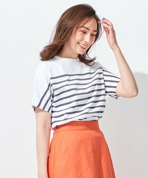 ドルマンシルエットのTシャツは女性らしい印象となり、パンツはもちろんスカートにも合わせやすい形です。