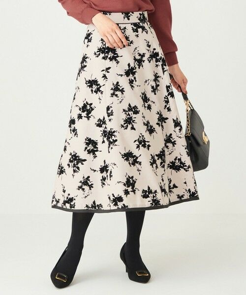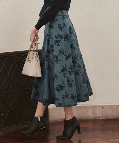 ブーケ調の花柄がプリントされたスカートです。花柄は一部分をぼかすことで抜け感と奥行きを出し、フロッキープリントという細かい繊維を接着する方法を用いて表情感豊かに仕上げています。美しいフレアシルエットが魅力の、秋冬らしいドラマティックな一枚です。