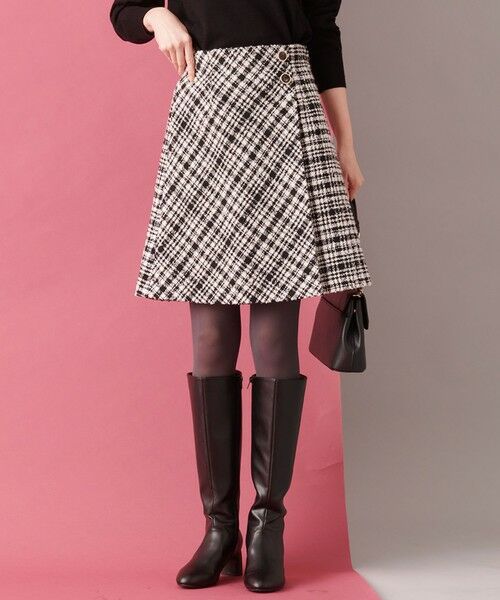 トレンドのミニスカートが秋冬らしいツイード素材で登場。可愛いチェック柄がコーデのポイントになります。ラップスカート風のデザインとボタンがクラシカルでレディライクな印象に。ややハイウエストなデザインでスタイルアップも狙えます。今年らしくロングブーツを合わせるのはもちろん、ショートブーツやパンプスも合わせやすい短すぎない着丈になっているので、足元のコーディネートを変えて楽しんで頂けます。