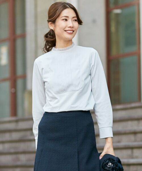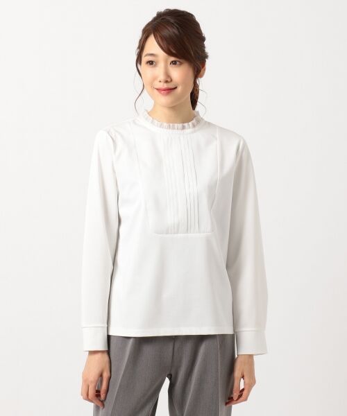 華やかなフリルディティールが女性らしい異素材ブロッキングプルオーバー ■デザイン前身頃に透け感のあるジョーゼットを重ね、タックディティールとフリルを施すことで、異素材ブロッキングさせたプルオーバーです。首周りにはフリルを施し、顔周りを華やかにさせます。ジャケットのインナーとしてお使い頂くのがオススメです。ジャケットから見える部分は、布帛できちんと感がありつつ、他の部分は伸縮性のあるジャージー素材なので着心地の良い仕様です。 ■素材感ハイゲージの編み機を使用したプレーティング天竺のジャージー素材をボディに使用しました。布帛のようなコンパクトな目面と透けづらくサラッとした肌触りが特徴です。太陽の光や熱を通しにくく、暑さを和らげる機能繊維を使用しました。※商品画像はサンプルを使用しているため、色味やサイズ等の仕様に変更がある場合がございますので、予めご了承ください。
