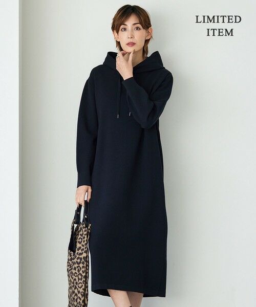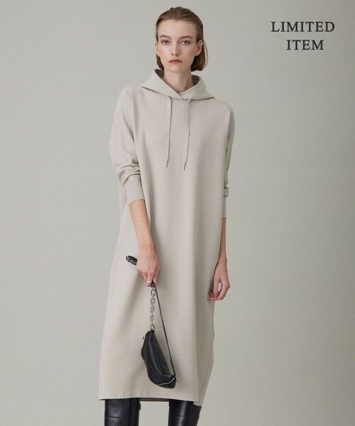 ゆったりシルエットのコンフォータブルニットワンピース。フード部分は360度どこから見てもふっくらときれいに立ち上がる様、またインナーをレイヤードしても綺麗見えが叶う様にサイジングにこだわりました。フード紐先には金属のチップを付けてツヤ感とエッジをプラスし、高級感ある仕上がりになっています。コートのインナーとしてもすっきりと着用していただけます。
