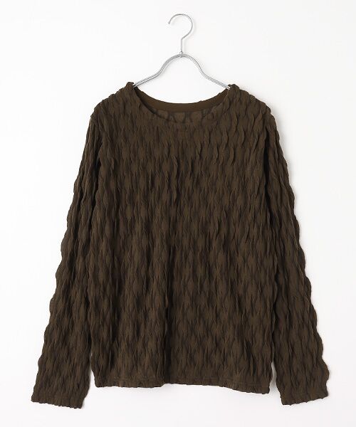 存在感のあるフリルジャガード素材でお作りしたロングスリーブTシャツ。一枚でもジレや羽織のインナーとしても大活躍してくれそうな商品です。●FABRICフリルの様な立体感のあるジャガード素材。肌触りも柔らかでウォーム感があるのが特徴です。