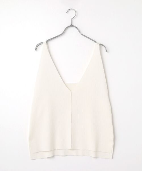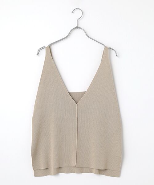 ドライタッチな糸を総針編みにしたキャミ型のニットベスト。Tシャツやブラウスのコーデにプラスするだけでボディーラインをカバーしながら秋のオシャレにフェイドインの一枚。サイドに深めのスリットが入っています。