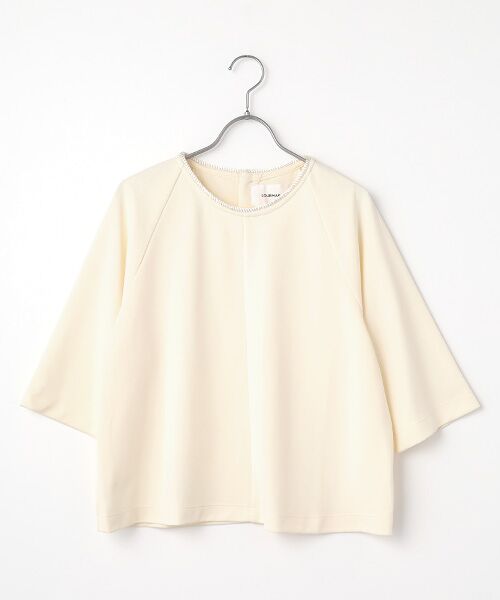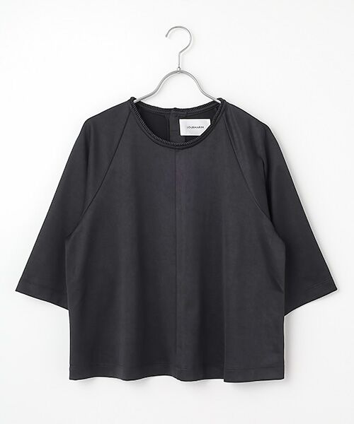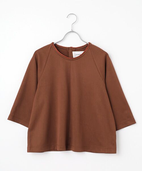 衿ぐりにコードを施した、6分丈のカットソー。ゆったりしたシルエットでやや短め丈の一枚。後ろ釦デザインでシンプルながら少しポイントのあるTシャツに仕上げました。●FABRIC適度な光沢のあるポリエステルコットンスムース。柔らかい肌触りで肌離れがいいのも特徴です。※画像の商品はサンプルです。実際の商品と色味、仕様、加工、サイズ、素材等が若干異なる場合がございます。