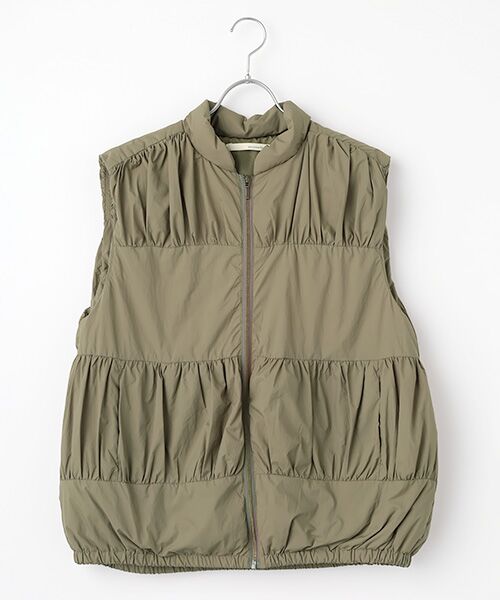軽い着心地で優れた保温性を発揮する高品質なダウンで作ったZIPベスト。特徴的なティアード風のデザインでいつものダウンベストをリニューアルしました。ギャザー部分とフラット部分で切り替えているので着ぶくれせずすっきりと着ていただけます。両サイドにポケットあり。※画像の商品はサンプルです。実際の商品と色味、仕様、加工、サイズ、素材等が若干異なる場合がございます。