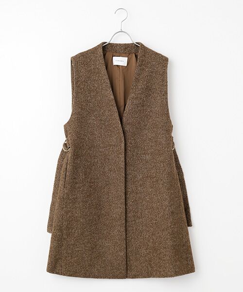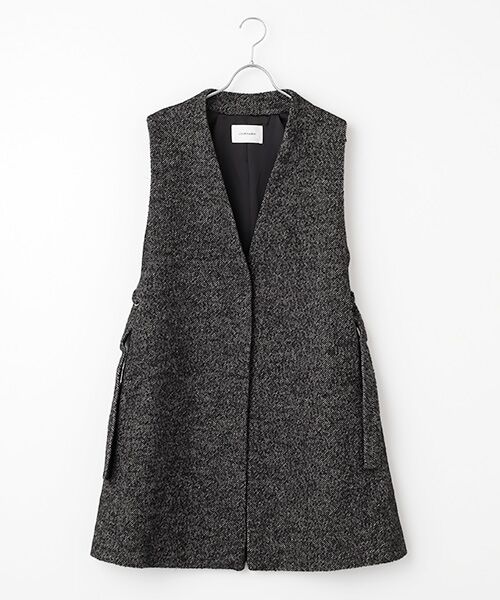 表面感のあるループツィードを使用したVネックのロングジレ。ジャケットの様なきちんと感に自然体の心地よさをプラスする、新しいオンタイムのワードローブにおススメの商品。サイドベルトでウエストマークするとスタイルアップでき、羽織るだけで洗練された装いに仕上がる一枚。●FABRICループ状の糸が生地表面に織り出された、ツィード素材。毛混のざっくりとした温かみのある風合いが特徴です。※画像の商品はサンプルです。実際の商品と色味、仕様、加工、サイズ、素材等が若干異なる場合がございます。