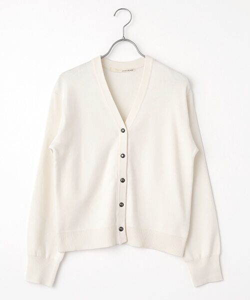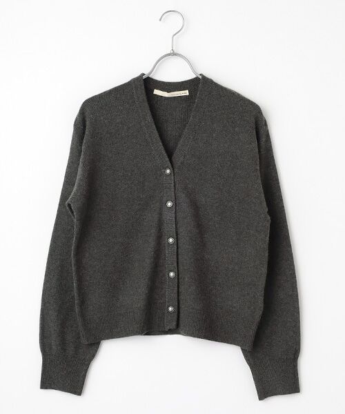 レーヨンポリエステルナイロンのモチモチした総針編みのVネックカーディガン。ベーシックなデザインでマットな金属のボタン使いをアクセントにしています。