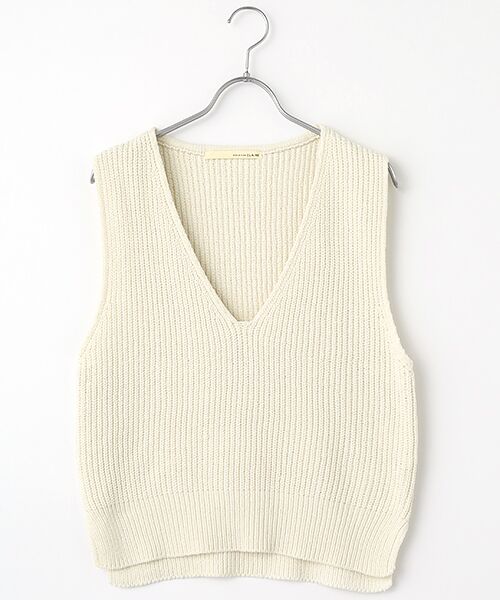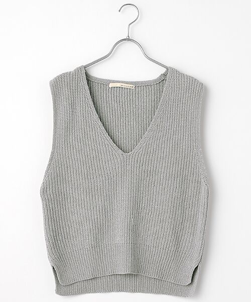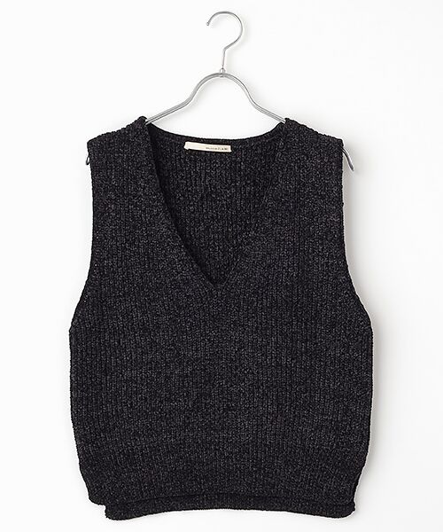 微光沢の滑らかなモール糸を度詰めの片畦に編立ています。シンプルなVネックベストです。サイドにスリットが入っています。毛羽立ちし難くて◎スタイリングのアクセントにおすすめな一枚です。