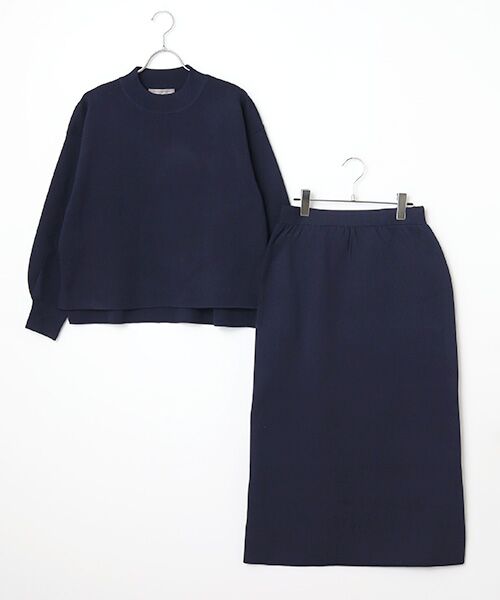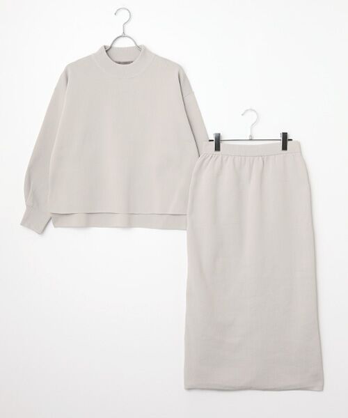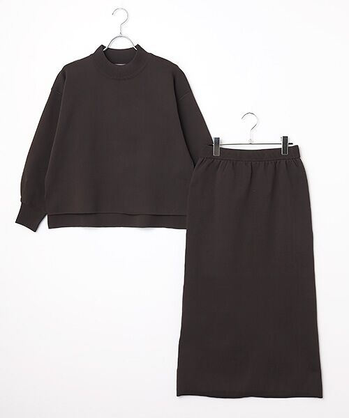しっかりとした編地で大人っぽくニットのセットアップを作りました。トップスは前身丈を少し短く後ろ丈を少し長くサイドにスリットの入ったフォルム感のあるモックネックのプルとウエストゴムと調整の出来る紐を施したストレートのロングスカートのセットアップ落ち着きのあるシーン、お仕事や学校の行事に◎単品でも着回し出来ておすすめです。●FABRICドライタッチなポリエステルの糸をトップスは総針編みスカートをハーフミラノで重さやボディラインを拾い難い編地に拘りました。※画像の商品はサンプルです。実際の商品と色味、仕様、加工、サイズ、素材等が若干異なる場合がございます。