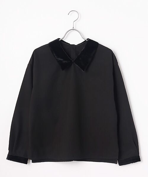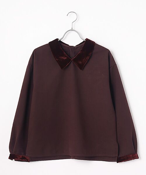 衿とボウタイ部分にベルベットを使用した後ろ釦開きのブラウス。シンプルながら袖口のボタンデザインや別布使いがアクセントになった商品。ほのかな華やかさが大人な印象のアイテムです。同素材でお作りしたパンツとのセットアップもおススメです。