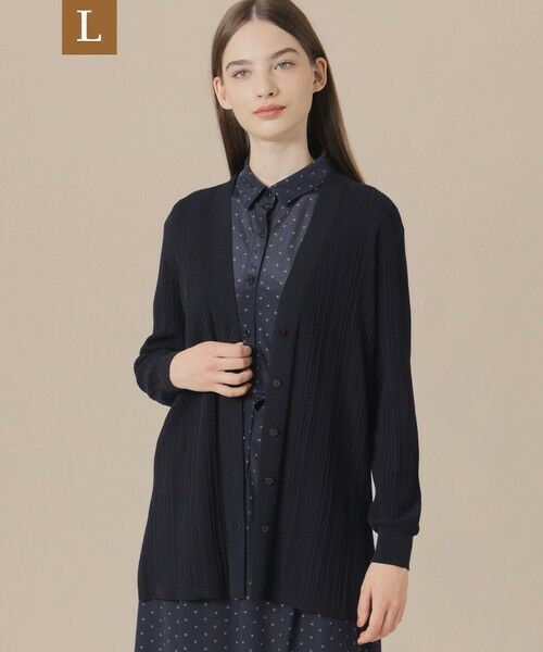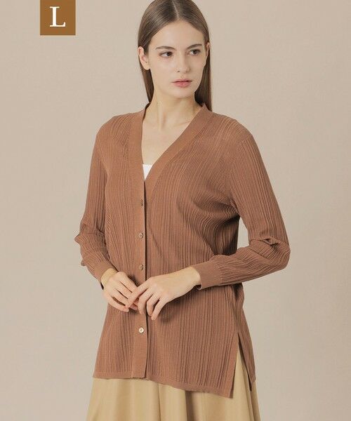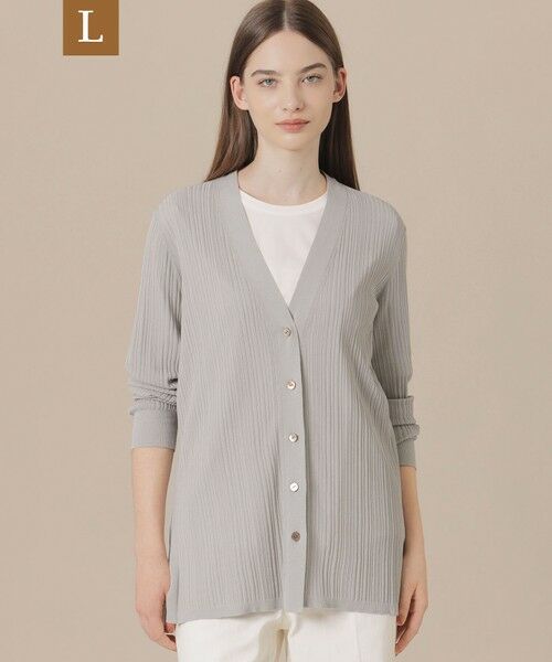 【ラージサイズアイテム】【ウォッシャブル】【着用推奨シーズン:春・夏】<素材説明>針抜き編みによる繊細な凹凸で陰影のあるシーアー素材です。極細コットン糸にポリエステルを撚糸し、肌離れ良いドライタッチな風合いです。<デザインポイント>繊細な透け感を生かしたVネックカーディガンです。針抜きの縦ラインで全体的にすっきりときれいに見えるシンプルなデザインに、脇のスリットで軽やかさを演出しています。軽くさっと羽織れ外出時や旅先の持ち運びもしやすい便利なアイテムです。
