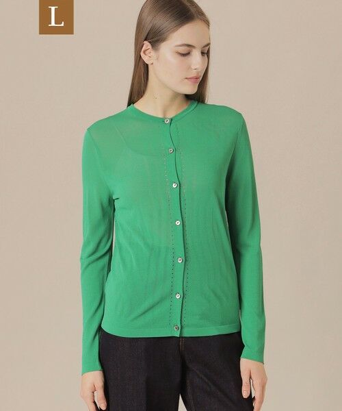 繊細なアイレットを前立てとサイドラインに施したシャープな印象のカーディガンです。ノースリーブなどの羽織に涼しげな印象のアイテムは春先から晩夏までご着用いただけます。