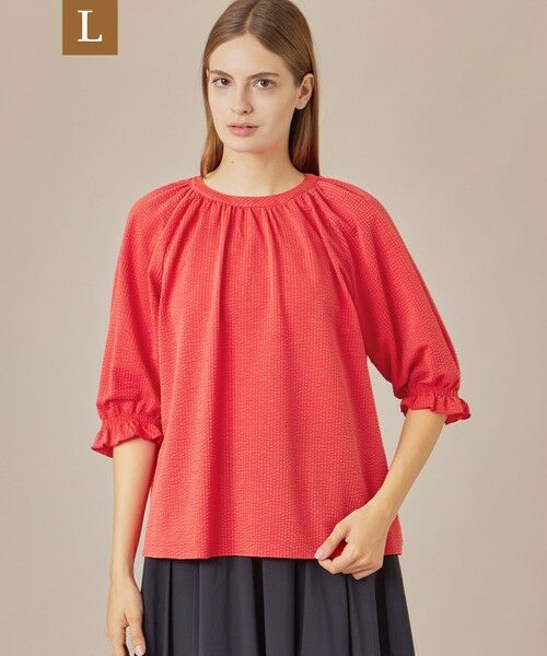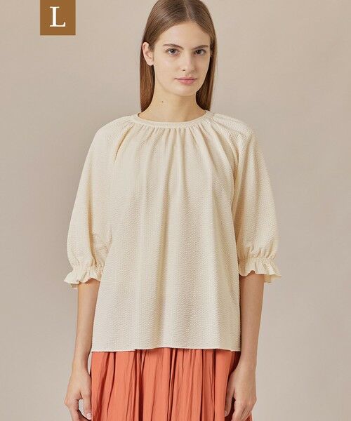 サッカー素材を生かした清涼感のあるブラウスです。袖口に繊細なギャザーを施したやさしいシルエットの袖は、二の腕をカバーしながら動きやすく着心地の良いエレガントな装いのアイテムです。
