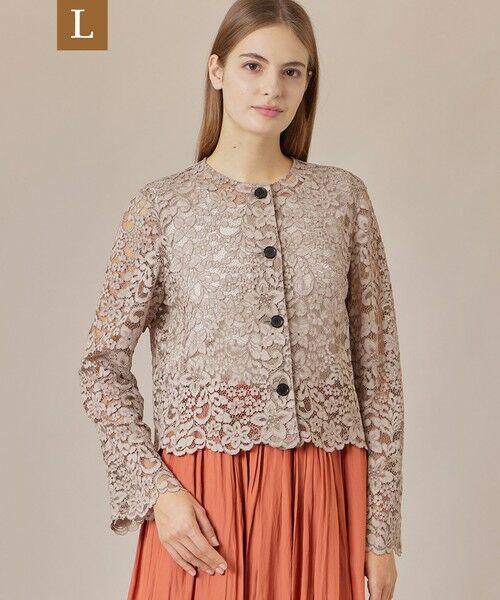 【ラージサイズアイテム】【ウォッシャブル】【着用推奨シーズン:春・夏・秋】<素材説明>大きさの異なる花で構成されたエレガントな雰囲気のラッセルレースです。コード糸により立体的に柄が浮かび上がり、高級感のある素材です。<デザインポイント>ワンピースやカットソーとパンツの上にサラッと羽織っていただけるラッセルレースジャケットです。裾に向けてやや広がるシルエットが軽やかでリラックスした雰囲気です。裏地なしです。
