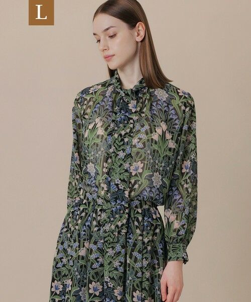 【ラージサイズアイテム】【ウォッシャブル】【着用推奨シーズン:春・秋・冬】<素材説明>シボ感が特徴のポリエステル楊柳生地で、ソフトな風合いと適度な透け感にドライタッチな表情が特徴です。プリントはロンドンの老舗デザインスタジオの伝統的な柄を元に、モダンにアレンジしたボタニカルフラワーです。<デザインポイント>衿もとのギャザーがアクセントのボウタイ付きブラウスです。袖口のギャザーが優雅な印象で、コートやニットのインナーとしても活躍するアイテムです。同素材のスカート(品番:G7S73694)もご用意しております。