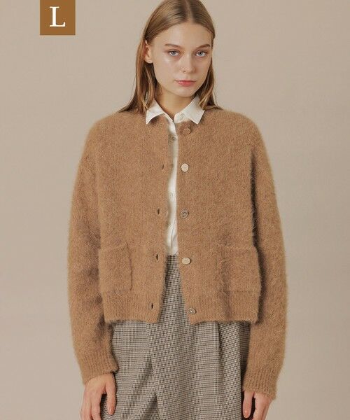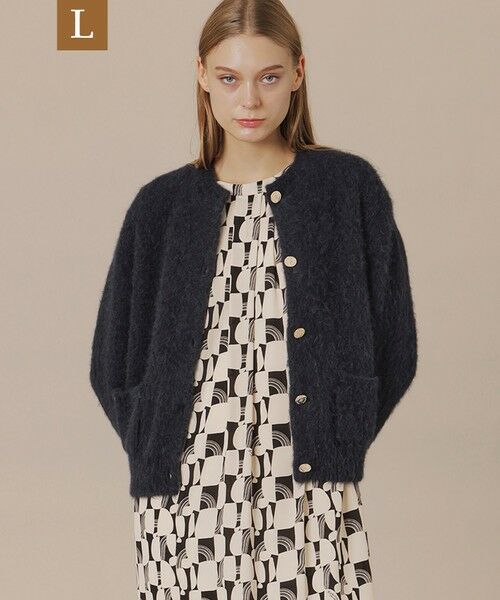 【ラージサイズアイテム】【着用推奨シーズン:秋・冬】<素材説明>イタリアACCADEMIA社の素材を使用しています。アルパカとナイロンの撚糸に起毛加工を施し、あたたかみのある風合いに、しっとりとした柔らかさとが特徴です。<デザインポイント>ゴールドボタンがアクセントになったジャケットライクなニットカーディガンです。着心地よく暖かみがあり、ジャケットのようなきちんと感も持ち合わせた一着です。袖までしっかりと裏地が付いており、柔らかくヘアリーな風合いのアイテムです。