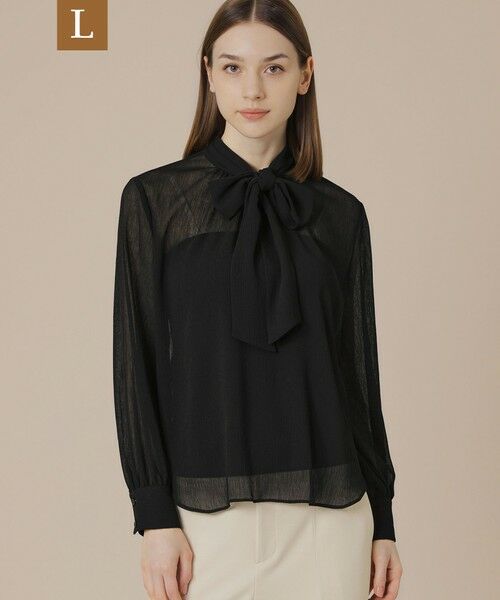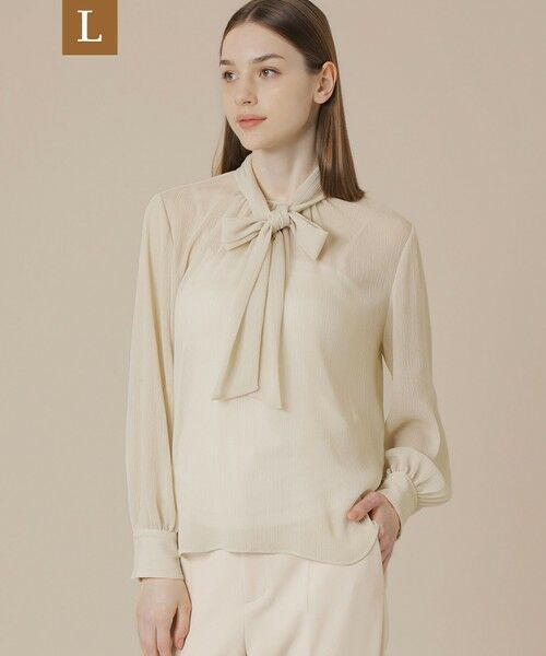 【ラージサイズアイテム】【ウォッシャブル】【着用推奨シーズン:春・秋・冬】<素材説明>強撚糸を使用しシルクのようなシャリ感とキメ細かい表情が特徴のポリエステルクレープ素材です。落ち感とともにエアリーで軽やかな風合いが特徴です。<デザインポイント>衿ぐりにギャザーを施したボウブラウスです。ジャケットのインナーとしても、表情のあるシアーな楊柳素材で1枚でも活躍します。インナー付き、同素材のワンピース(品番:G7J09621)もご用意しております。