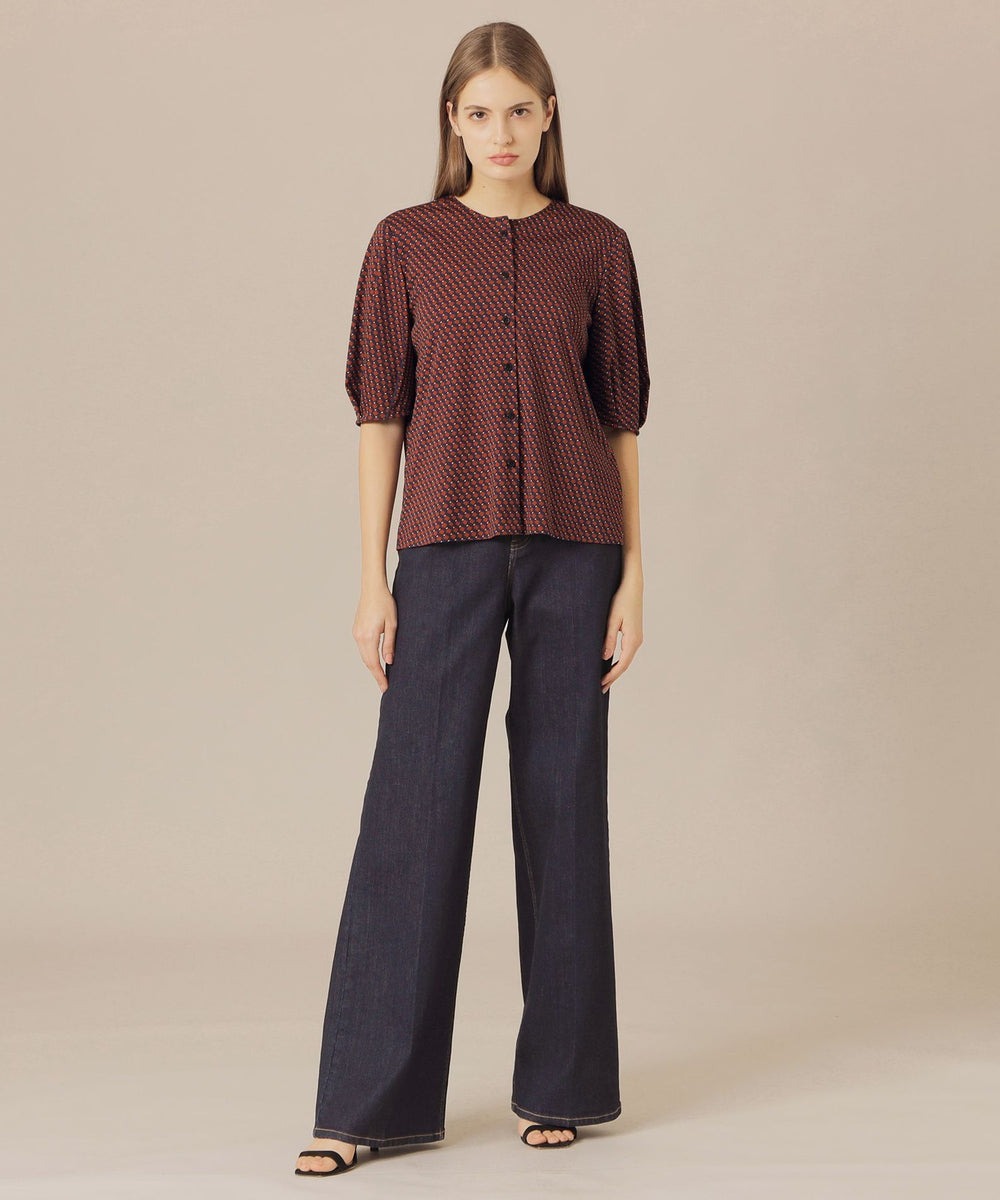 サラサラとした爽やかな肌触りでソフトな着心地のジャージ素材。袖口に寄せたタックがポイントで、オンオフ使える汎用性の高いブラウスです。綿麻のデニム生地です。柔らかく、ドレープ性もあり触り心地のよい素材で、清涼感もあり暑くなる季節に活躍します。
