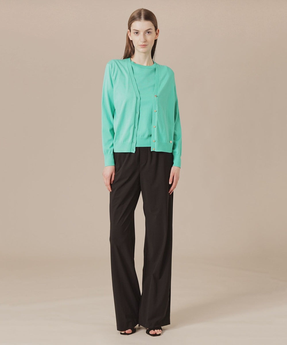 成型編みでバストダーツを入れ、着用時きれいに体にフィットするよう立体的に仕上げたカーディガンです。ミニマルなデザインに金属ボタンがポイントです。同素材のプルオーバー(品番:G5N02500)とアンサンブルで着用いただけます。