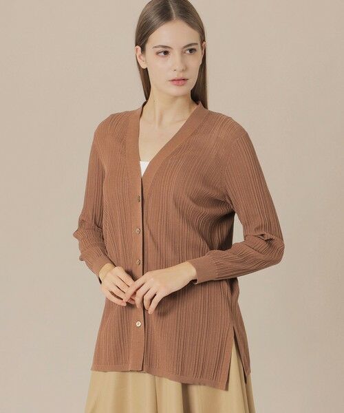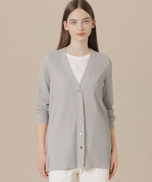 繊細な透け感を生かしたVネックカーディガンです。針抜きの縦ラインで全体的にすっきりときれいに見えるシンプルなデザインに、脇のスリットで軽やかさを演出しています。軽くさっと羽織れ外出時や旅先の持ち運びもしやすい便利なアイテムです。