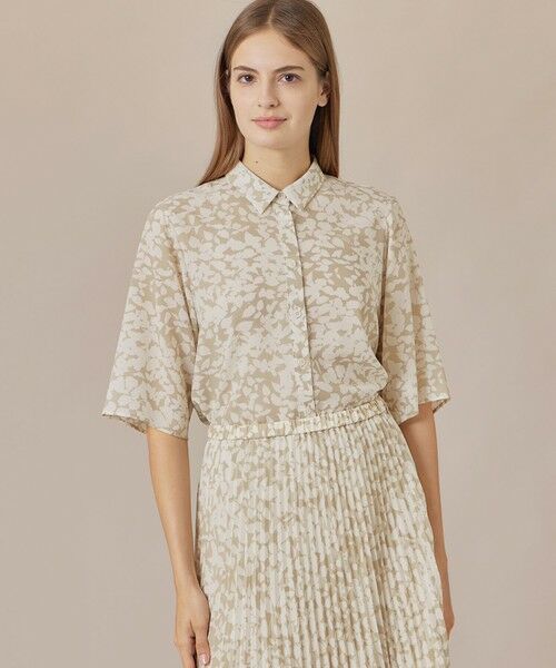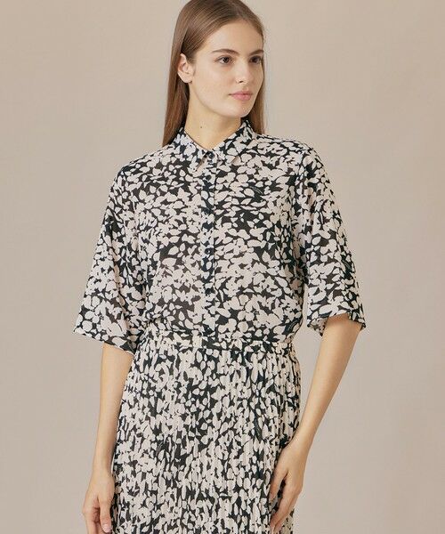 ボクシーなシルエットで抜け感のあるワイドスリーブのシャツブラウスです。ゆったりとしたシルエットの中にシャツカラーとセットインスリーブを取り入れ、きちんと感も演出しています。タックイン・アウトどちらの着こなしもバランス良く合わせていただける着丈です。同素材のスカート(G5S66587)、ワンピース(G5J63587)もご用意しております。