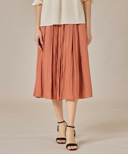 程よく寄せたギャザーでエレガントな印象に仕上げたスカートです。バックウエストはゴムで着心地が良く、タックイン・アウトどちらのスタイリングも美しく着こなしていただけます。パンプスはもちろんフラットシューズやサンダルとも相性の良い丈感もポイントです。軽やかな着心地で、オンオフ問わず幅広いシーンで活躍するアイテムです。裏地付きです。