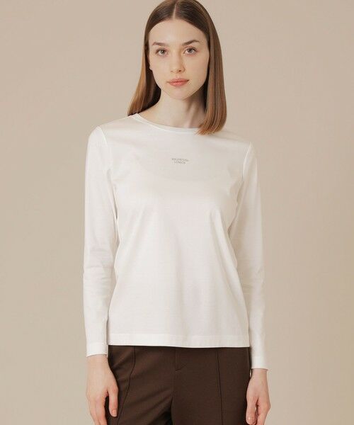 【ウォッシャブル】【着用推奨シーズン:春・秋・冬】<素材説明>厳選された超長綿をブレンドし、毛羽の少ないコンパクト紡績で原綿が持つ本来の光沢感と繊細さを最大限に引き出した素材です。<デザインポイント>胸元に小ぶりなロゴをプリントした長袖Tシャツです。白(#01)にはグレー、黒(#09)には白の配色で細いロゴをシャープで繊細に仕上げています。プリントから製品まで日本で仕立てています。※この商品はサンプルで撮影を行っています。実際の商品とイメージ、仕様等が異なる場合がございますので予めご了承ください。