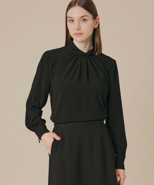 衿にねじりディテールを施したブラウスです。衿元のギャザーと袖口のタックの膨らみがエレガントな印象で、ノーカラーのジャケットやカーディガンとのスタイリングに活躍します。同素材のワンピース(品番:G5J13639)もご用意しております。