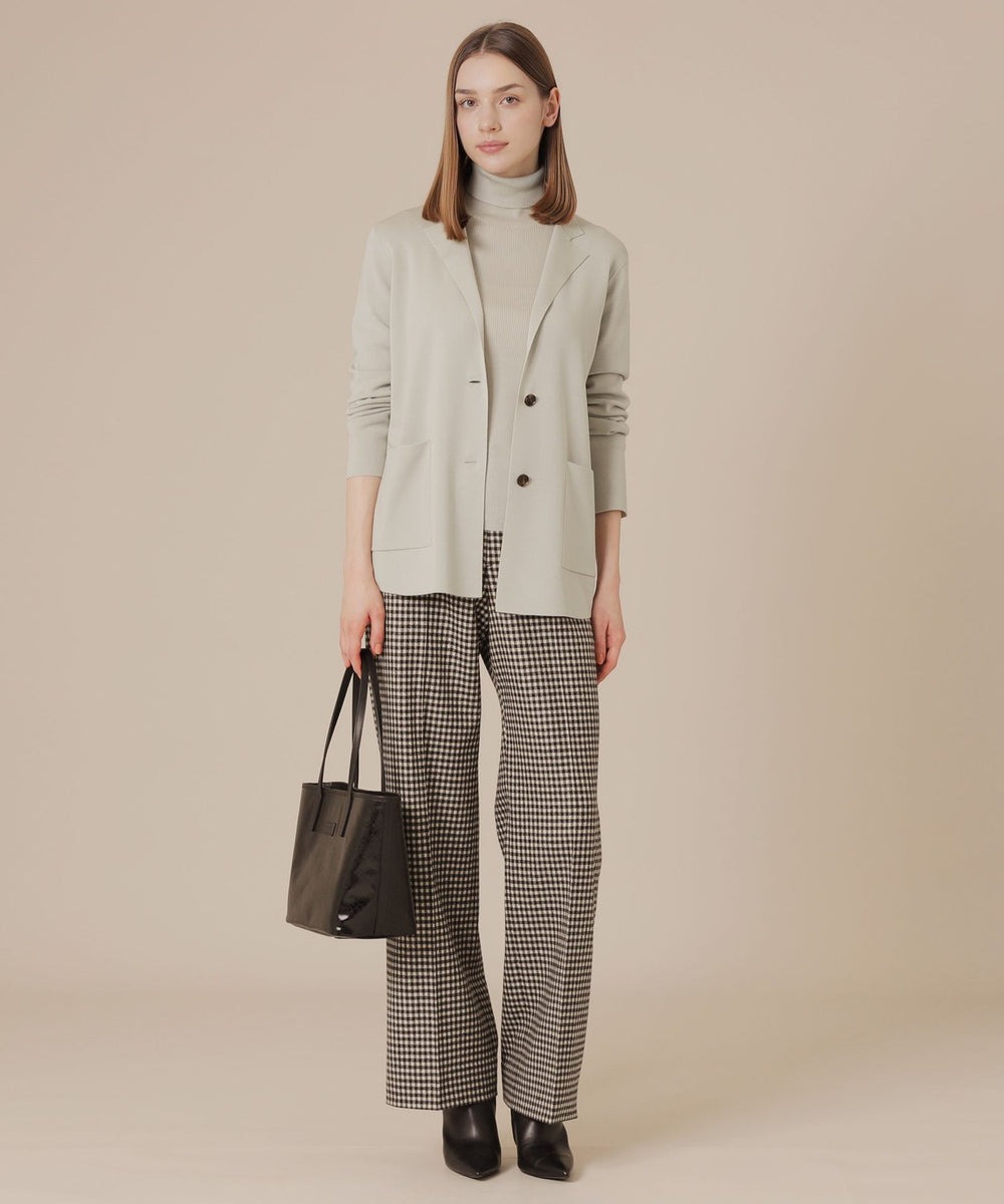綺麗な表面感が上品な印象のニットジャケットです。季節の変わり目の羽織りとして、ニットの着心地良さにきちんと感も備え、着回し力抜群のアイテムです。裏地なしですタートルネックのプルオーバーやブラウス、Tシャツとのコーディネートがお勧めです。