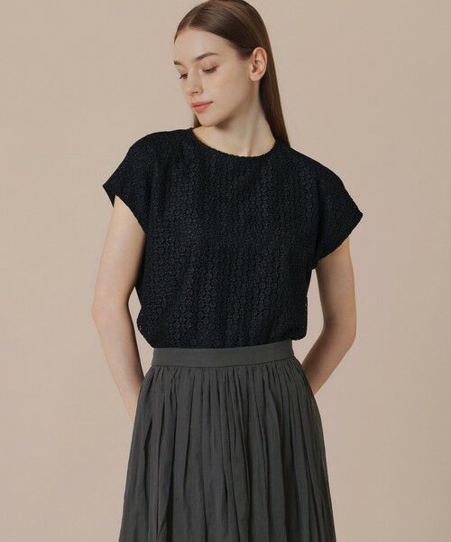 前身頃にレースを使用した、素材のコンビネーションが印象的なトップスです。ボトムを問わず着回ししやすいアイテムです。