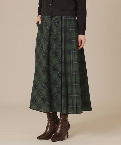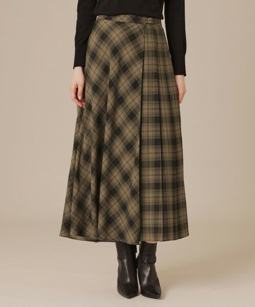 右身頃がバイアスのフレアー、左身頃がプリーツのデザイン性あるキルトスカートです。シンプルなニット合わせでスタイリングが決まります。フロントは中で繋がり着用しやすく、シアーなウール素材で軽く優雅な印象です。裏地付きです。同素材のブラウス(品番:G5M15624)もご用意しております。