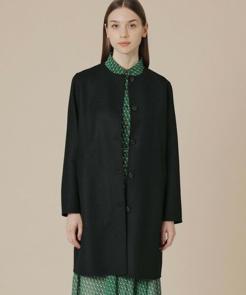 繊細なリバー仕立てで軽快なノーカラーコートです。クリーンな印象でパンツ、スカート、ワンピースにも合わせやすくコーディネートに活躍します。衿元からタートルニットをのぞかせたり、スカーフでアクセントにしたりとスタイリングの汎用性もあります。裏地なしです。同素材のコート(品番:G5B12634)もご用意しております。