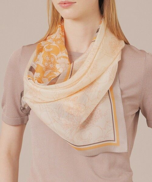 バイブリーフラワー柄2WAYのループドスカーフです。2種のスクエアスカーフを繋ぎ筒状に仕立てた形になっており、筒状の部分を折り込んで首に通せば、簡単に身に着けられ、また、そのままロングの状態でスカーフ使いもできる仕様となっています。繊細な柄を熟練した職人が丁寧に手捺染し仕上げたMADE IN JAPANのスカーフです。