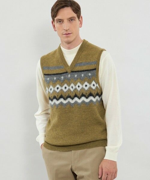 ベーシックなデザインのVネックベストです。ジャケットのインに着た時にきれいに収まるようVネックの開きに拘りました。レギュラーフィットですが、アームホールにややゆとりを持たせておりクラシック過ぎない、ほんのりモード感のあるシルエットです。前身頃にフェアアイル柄をジャカードで編み、起毛を掻いて雰囲気良く仕上げています。