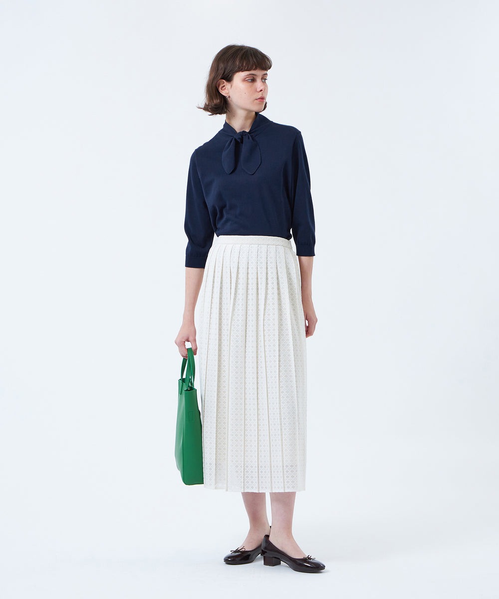 顔周りに華やかさをもたらしてくれるリボンタイニット。 コートやジャケットと合わせて首元デザインを覗かせたスタイリングもおすすめです。合わせるボトムス次第でデイリーからセレモニーなどのセミオケシーンにも活躍。もたつきのない七分袖は上品な抜け感を演出します。