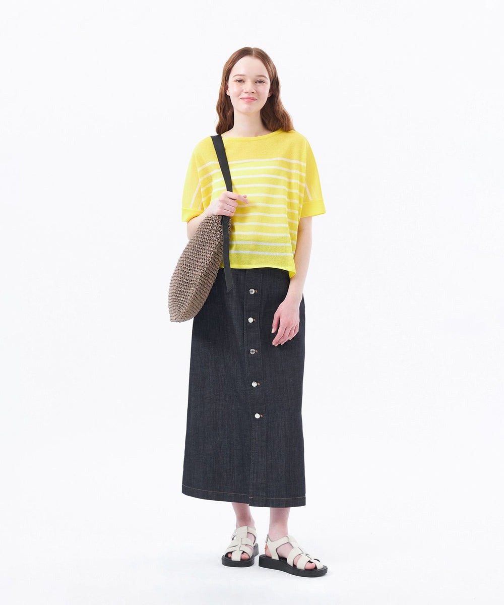 清涼感のあるシアー素材のボーダー柄が、爽やかな印象のニットプルオーバー。 ゆとりのあるシルエットと肌離れの良い素材で汗ばむ季節にも最適です。 スカートはロング丈とややAラインのシルエットが、カジュアルになり過ぎず大人な印象に。飽きのこない定番的アイテムでシーズンレスで活躍します。