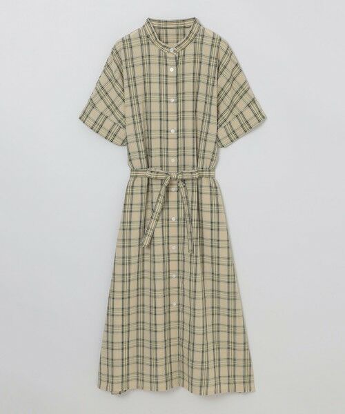 バンドカラーチェックワンピース。オリジナルチェック柄をリラックス感のあるドルマンスリーブのシャツワンピースデザインに落とし込みました。共地ベルト付き。
