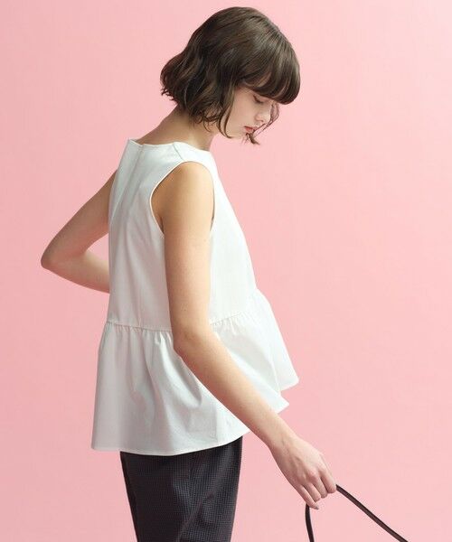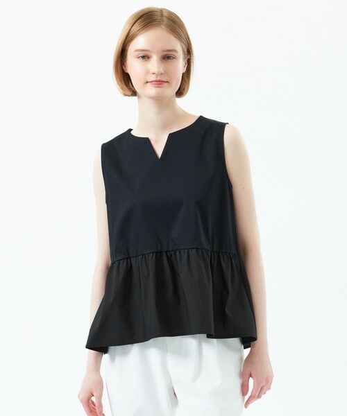 布帛素材で切り替えたペプラムデザインが、一枚で着映えするノースリーブカットソー。