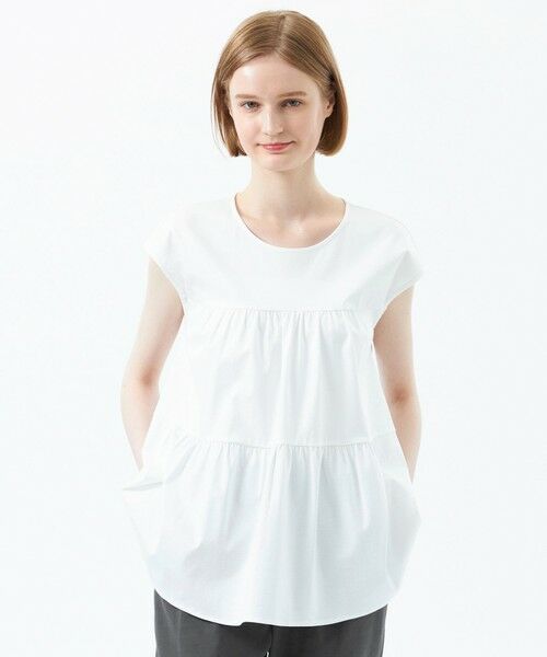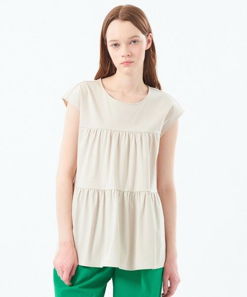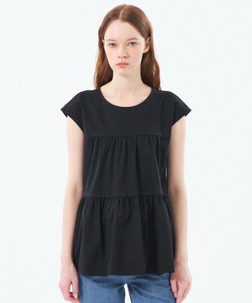 <一枚で華やかなデザインカットソー>ティアードデザインが可憐な印象のカットソー。後身頃はギャザーを入れず、膨らみすぎないシルエットに調整しています。ヒップにかかる丈感で、ボトムスのシルエットを選ばずコーディネートが可能です。【素材】綺麗な目面に編んだスムース組織のカットソー素材です。シルケット加工により、光沢感・張り感・滑らかな着心地が特徴です。おすすめ着用期間:春/夏/秋※この商品はサンプルでの撮影を行っています。実際の商品とイメージ、仕様が異なる場合がございます。こちらの商品は一部店舗とオンラインストア限定商品です。 WEB限定商品は、予告なく一部店舗で展開される場合もございます。