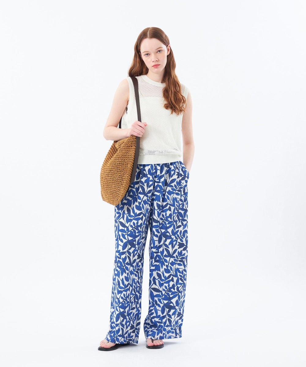 メッシュ編みのニットベストはTシャツとのレイヤードスタイルはもちろん、タンクトップと合わせて抜け感のあるコーディネートをお楽しみいただけます。秋口にはシャツとのレイヤードもおすすめです。パンツは夏を感じるボタニカルプリント。ウエストゴム仕様、肌触りも良く着心地の良い素材です。