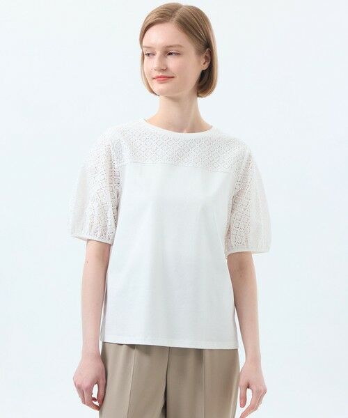 Tシャツのようにイージーな着心地と、ブラウスのように上品な印象のレース使いがポイントです。