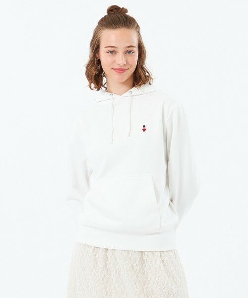 胸元のワッペンがアクセントのプルオーバーパーカー。普段使いのコーディネートに合わせやすいプレーンなデザインです。