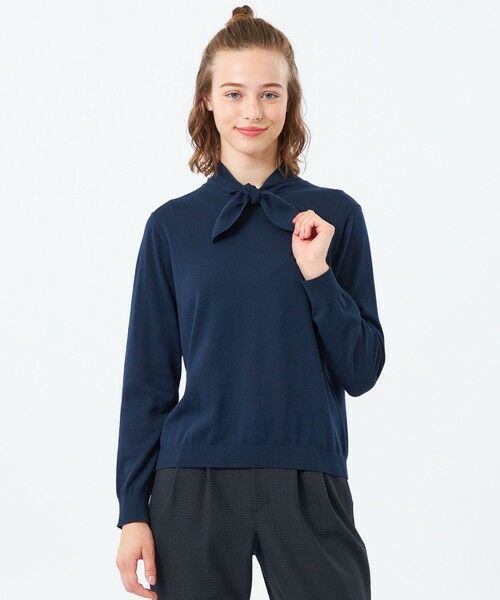 <スカーフ風のリボンタイがポイントのニットプルオーバー>顔周りに華やかさをもたらすリボンタイニット。首元にデザインがあるので、ジャケットと合わせてリボンタイを覗かせたスタイリングもおすすめです。合わせるボトムス次第でデイリーからセレモニーなどのセミオケシーンにも活躍。ロングシーズン活躍するコンパクトコットンを使用しているので、柔らかな着心地。クリアな表面感が上品見えのポイントです。【素材】上質で繊維長が長い原綿を使用して特殊な紡績技術(コンパクトスピニング)により紡績した綿素材。毛羽が極めて少なく、シルクのような光沢や滑らかさが特徴です。おすすめ着用期間:春/夏/秋/冬※36サイズはオンラインストア、ルミネ新宿店、柏?島屋ステーションモール店、ジェイアール名古屋タカシマヤ店、山形屋店、博多阪急、阪神梅田本店のみでのお取扱いになります。※この商品はサンプルでの撮影を行っています。実際の商品とイメージ、仕様が異なる場合がございます。